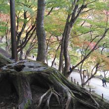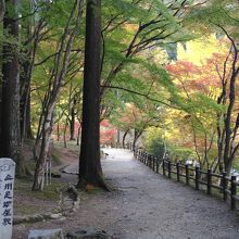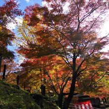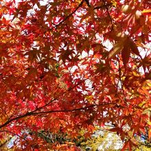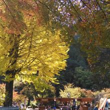 紅葉シーズン真っ盛り。今年は11月中旬でも一部のみ赤く紅葉し、一帯が赤く染まるのはまだ先のよう。広場から一段下りた川沿い辺りはかなり赤く見頃。イチョウの黄色と素晴らしい景色です。落葉間近のイチョウが輝き風が吹くとひらひらと落ちてくる様子も素敵でした。
