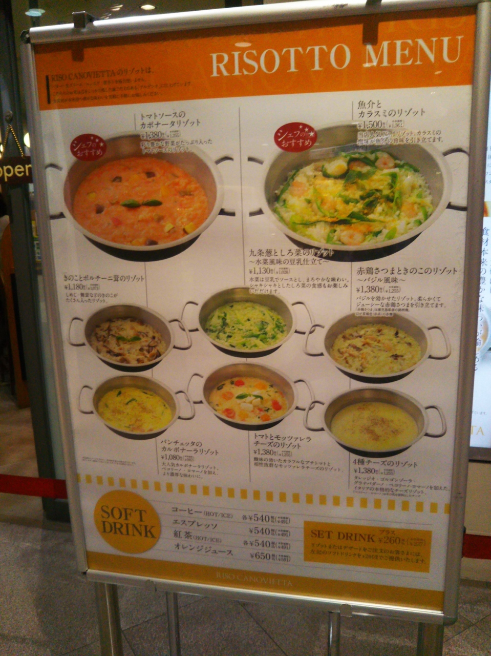 JR東京駅の構内にある地下商業施設、グランスタにあるレストランです。珍しいリゾットの専門店です。朝7時からオープンしており、モーニングリゾットをいただきました。トマトの酸味とモッツァレラチーズのまろやかさがおいしかったです。九条ねぎを使用した和風リゾットなどもありました。