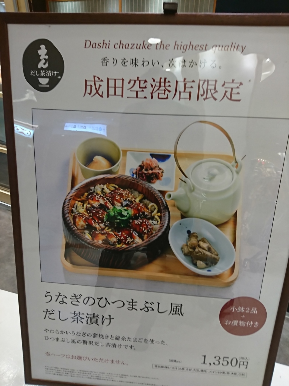 空港限定メニューで鰻を使ったお茶漬けがでていました。鰻を食べれる場所は少ないですし、お茶漬けスタイルなのであっさりと食べれ、搭乗前には胃に優しいです。外国の観光客の方にもお茶漬けの美味しさを知って欲しいなと思いますし、鰻も珍しいので試すには安価で良いです。