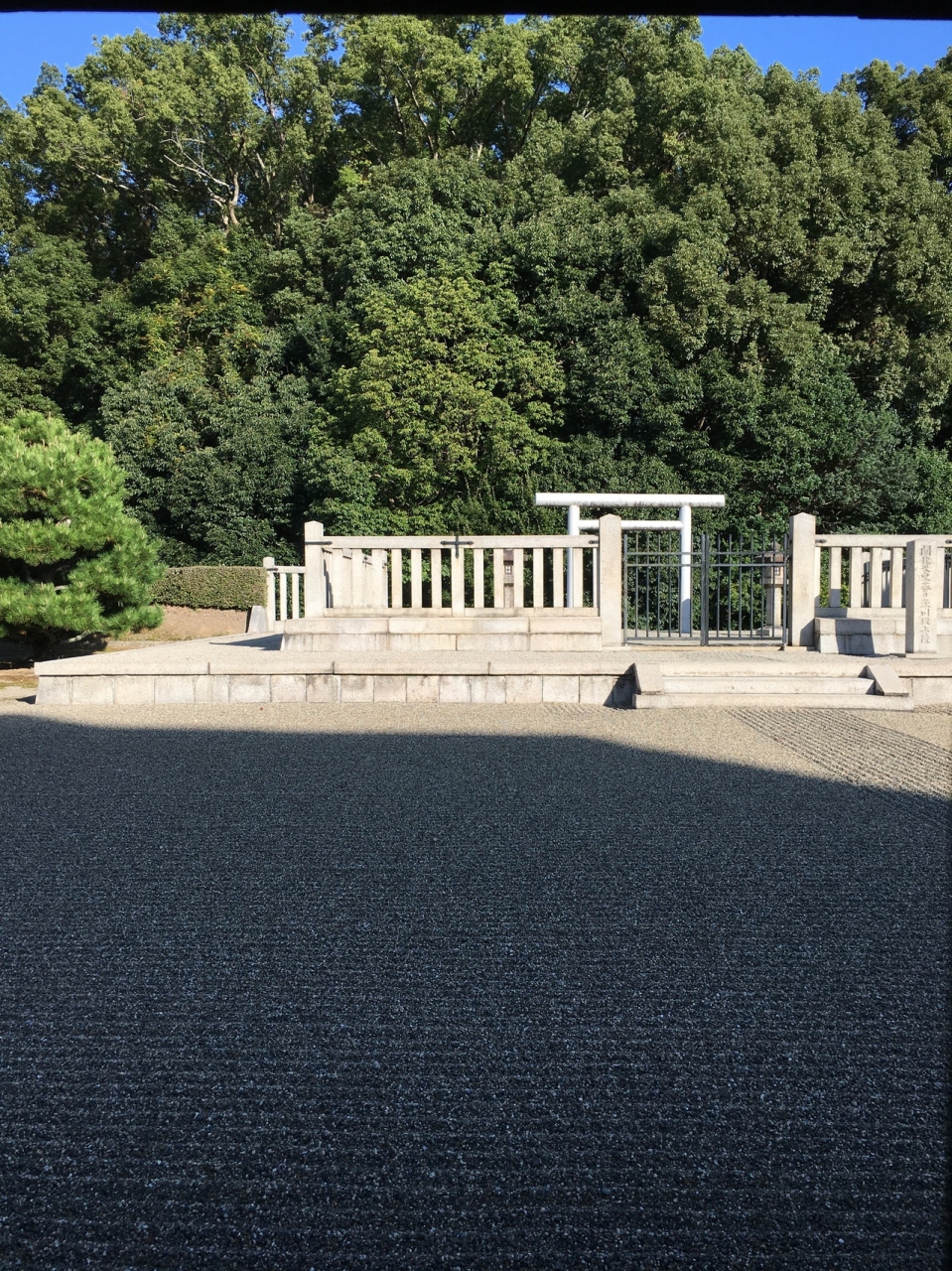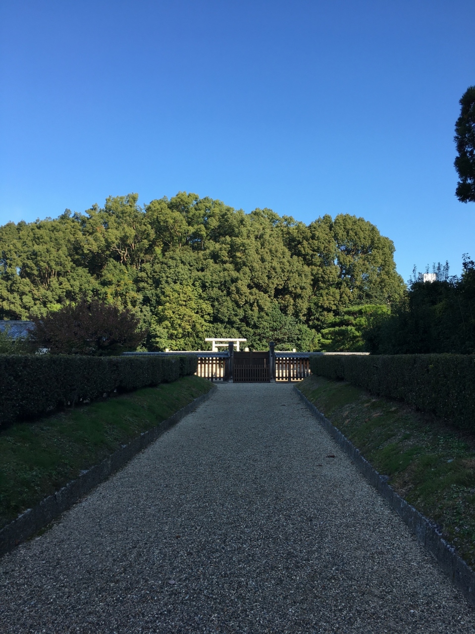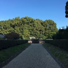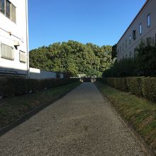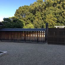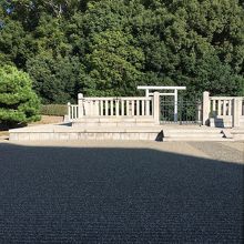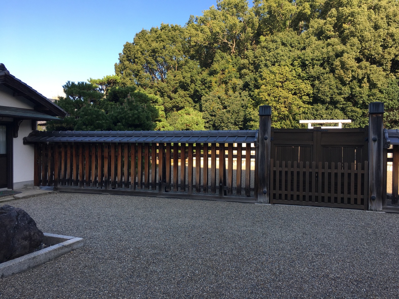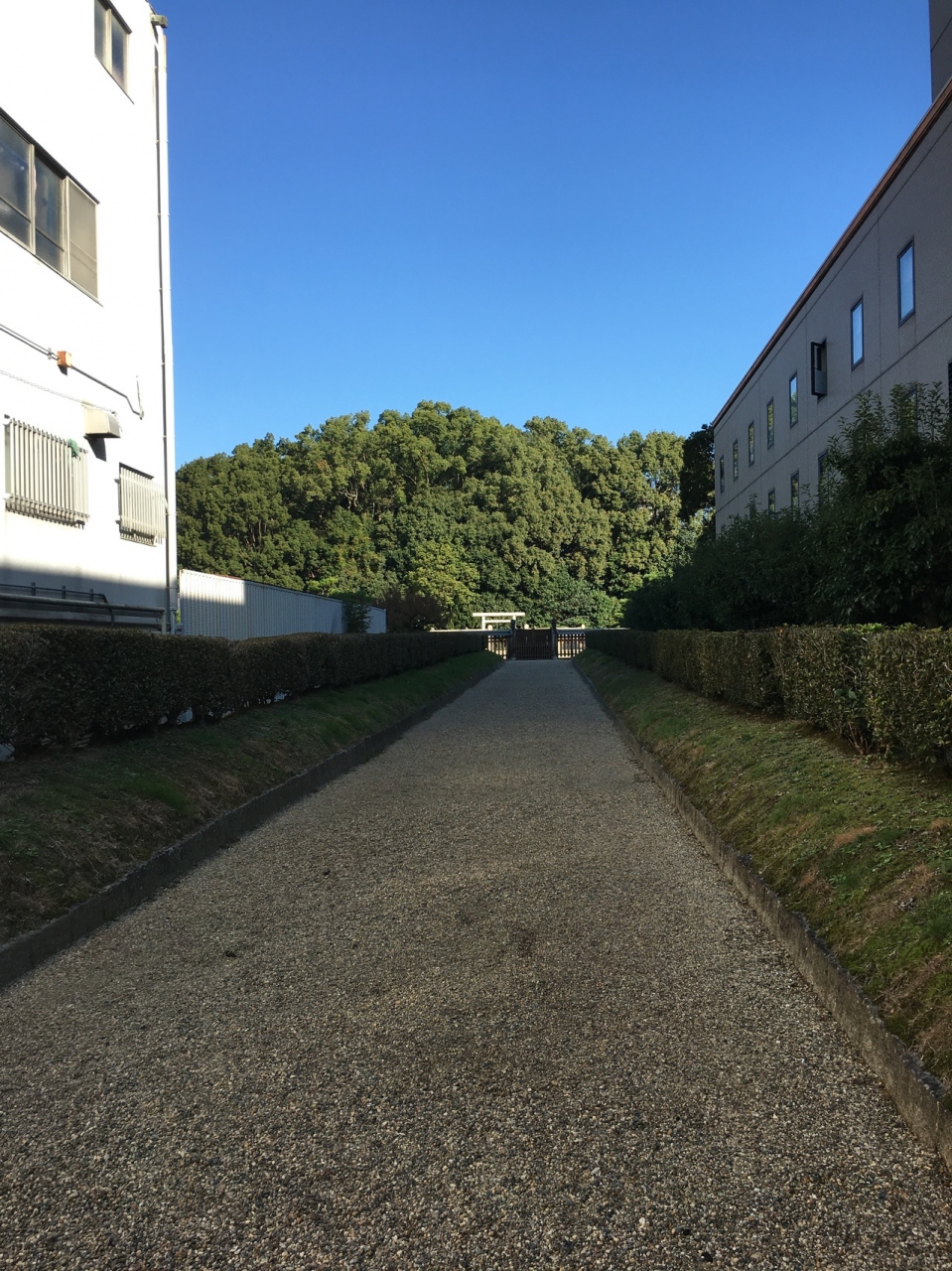 商店街の通りから逸れた脇道の小さな砂利の道を歩くと鳥居があり、後ろには木々があって林になっていました。前には木の境があり、左側に小さな建物があります。敷居の中にも砂利が敷いてあり、線が敷いてあるように綺麗には整備されていて静かな場所でした。