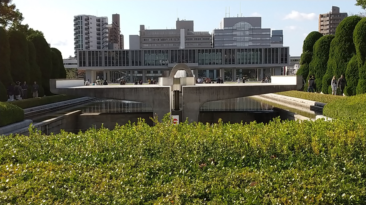 平和公園のちょうど真ん中で,世界から核がなくなることを願って絶えず灯されている火です。両手を広げたその上に火がともっているように,モニュメントが作られています。平和公園内でたくさんの慰霊碑を見て,資料館を見て,平和を願いながらこの火を目に焼き付けました。