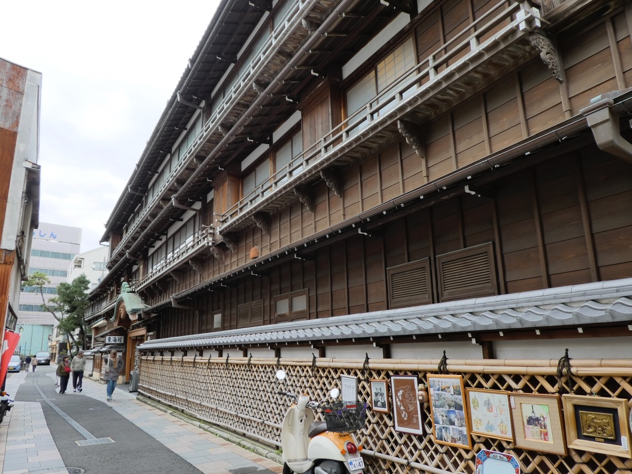 伊東市内を流れる川に沿ってある木造3階建の重厚な雰囲気の木造建築。かつては温泉旅館だったのが今は文化財。