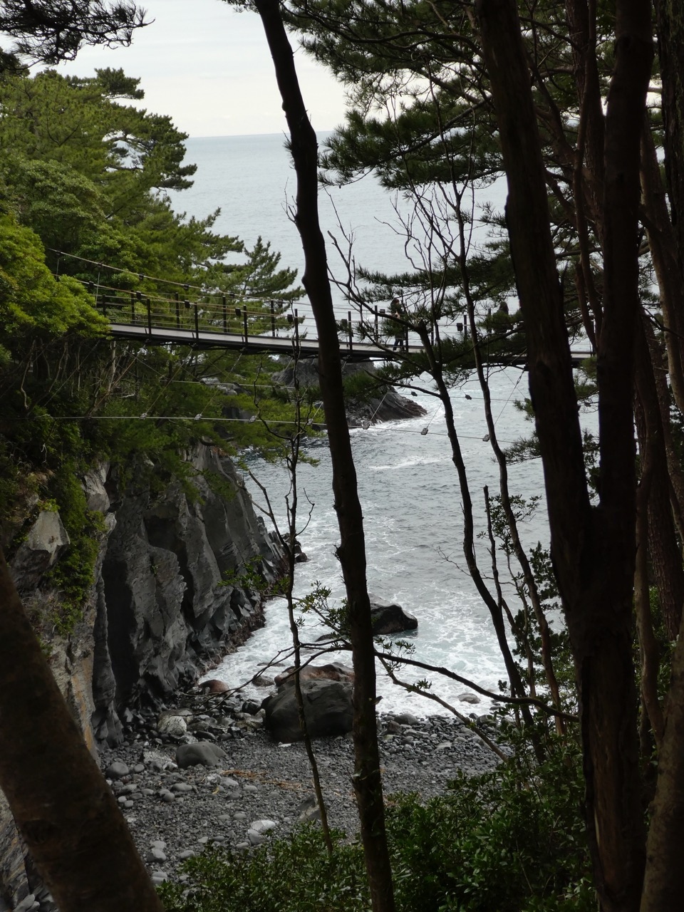 伊豆高原駅から踏切を渡って、小川に沿って一直線に海へ。滝になって直接海に落ちる小川の河口から右に数分。吊り橋が出現。このあたりが橋立というようです。そこに架かる橋です。海を渡る、というよりは入江を渡る感じ。なので下は荒波ではないので景色としてはいまひとつ。高さ感もちょっと感じられず。