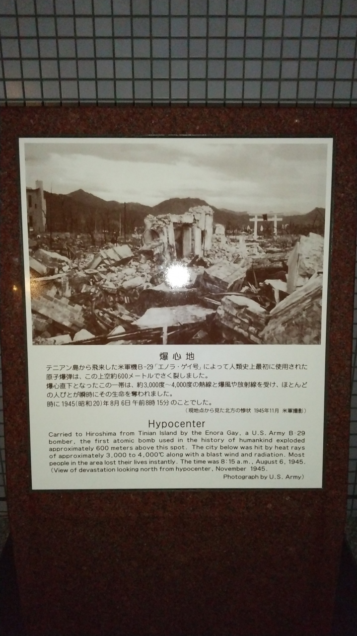 平和公園から少し歩いたところ、住宅地の中に、爆心地であることを示す看板がひっそりとあります。この地に原爆が投下されたことに思いを馳せると、復興を遂げることができたことへの素晴らしさと、戦争の悲惨さを、改めて実感しました。