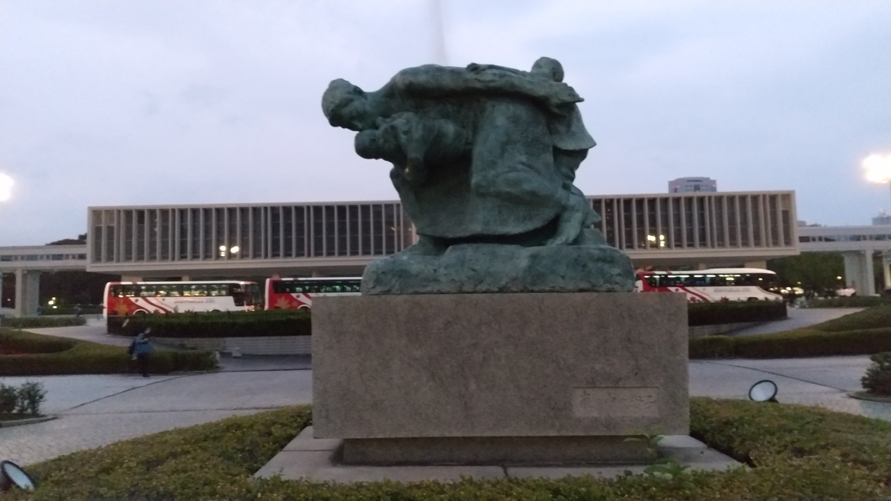 平和公園の南側、平和記念資料館の前にある像。右手に乳児を、左手に幼児を抱え、二人の子を必死で守ろうとする母親の姿が表現されています。結果的にこをまもることができず辛い思いをした母親がたくさんおられたであろうことを思うと、戦争の悲惨さを改めて実感しました。