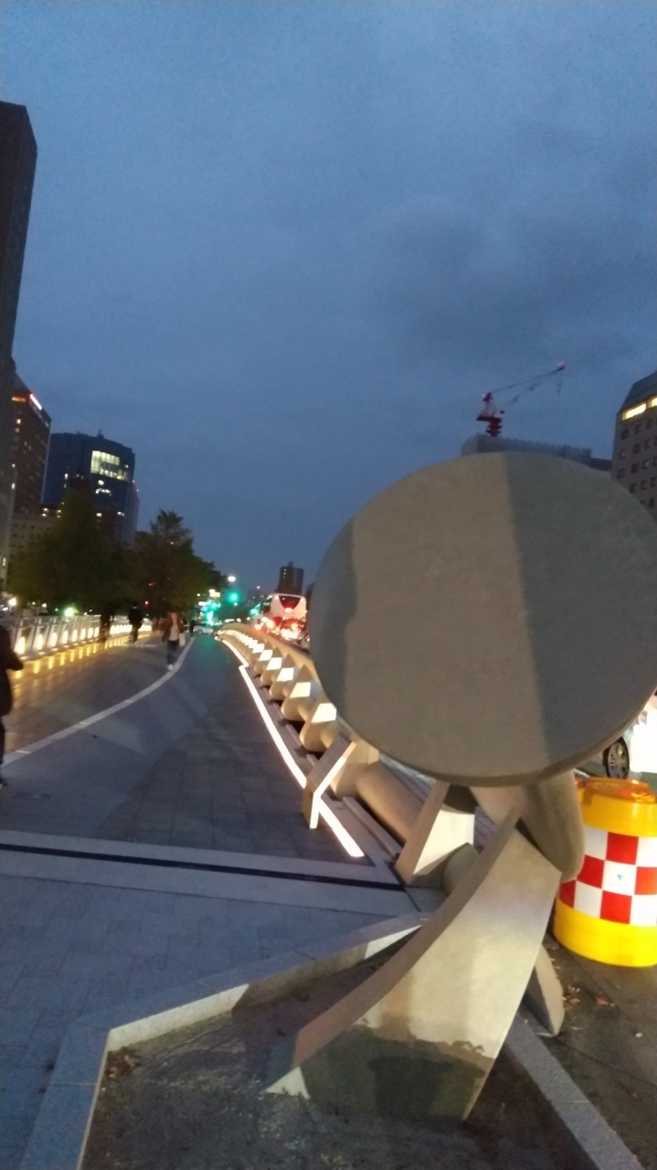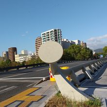 元安川に架かる橋。平和大通りから平和公園に向かう途中に通りました。アメリカのデザイナー、イサム·ノグチ氏によるデザインとのことで、デザイン性が高くお洒落な雰囲気です。夜はライトアップが、昼は青空との対比が素敵です。