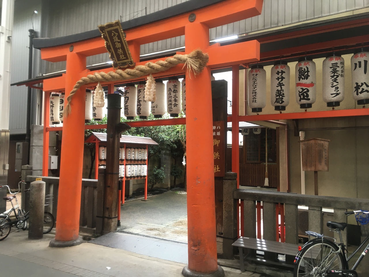 京都三条会商店街の中に見つけました。八坂神社の場外末社で「ごくうしゃ」と読みます。祇園祭の際に神輿に載って神様がこちらでご休憩、ご宿泊されるそうです。元は神泉苑の広大な境内にあったものらしいです。四条通りにも御旅社があります。