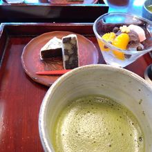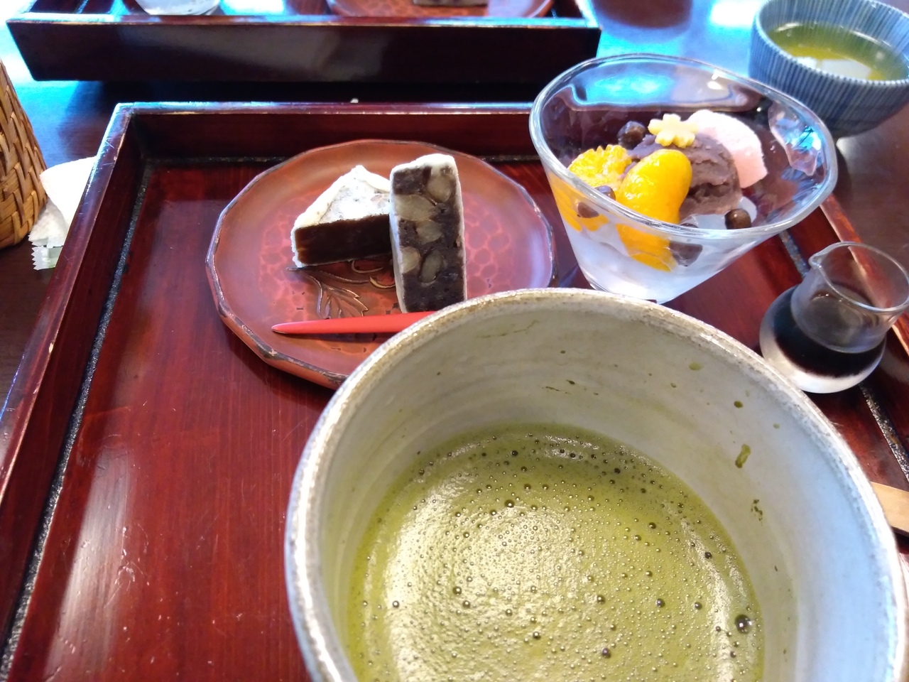 キンツバも美味しそうだし、あんみつも食べたいし...と迷っていたら、キンツバ、ミニあんみつ、抹茶のセットがありました!あ~、疲れが取れるよ~。
