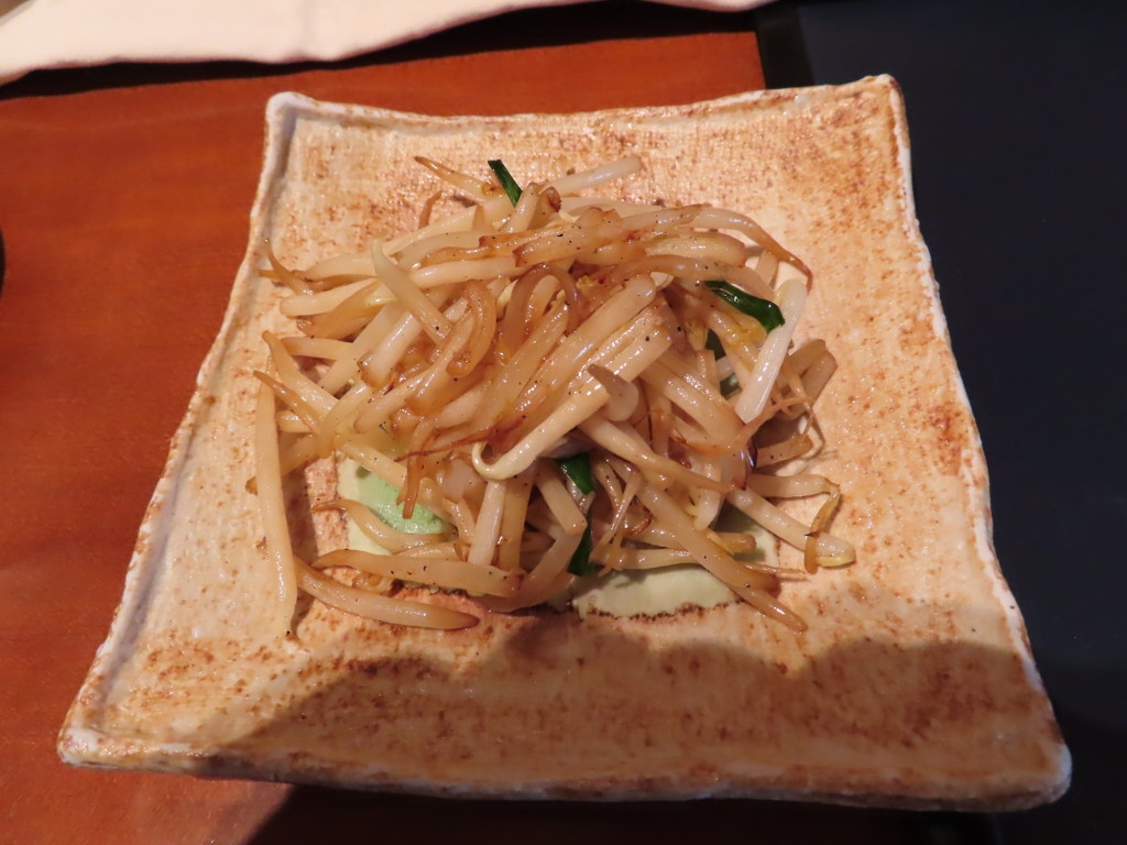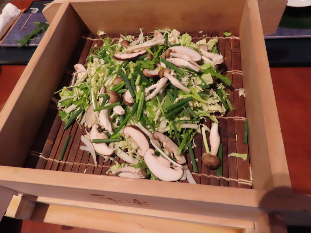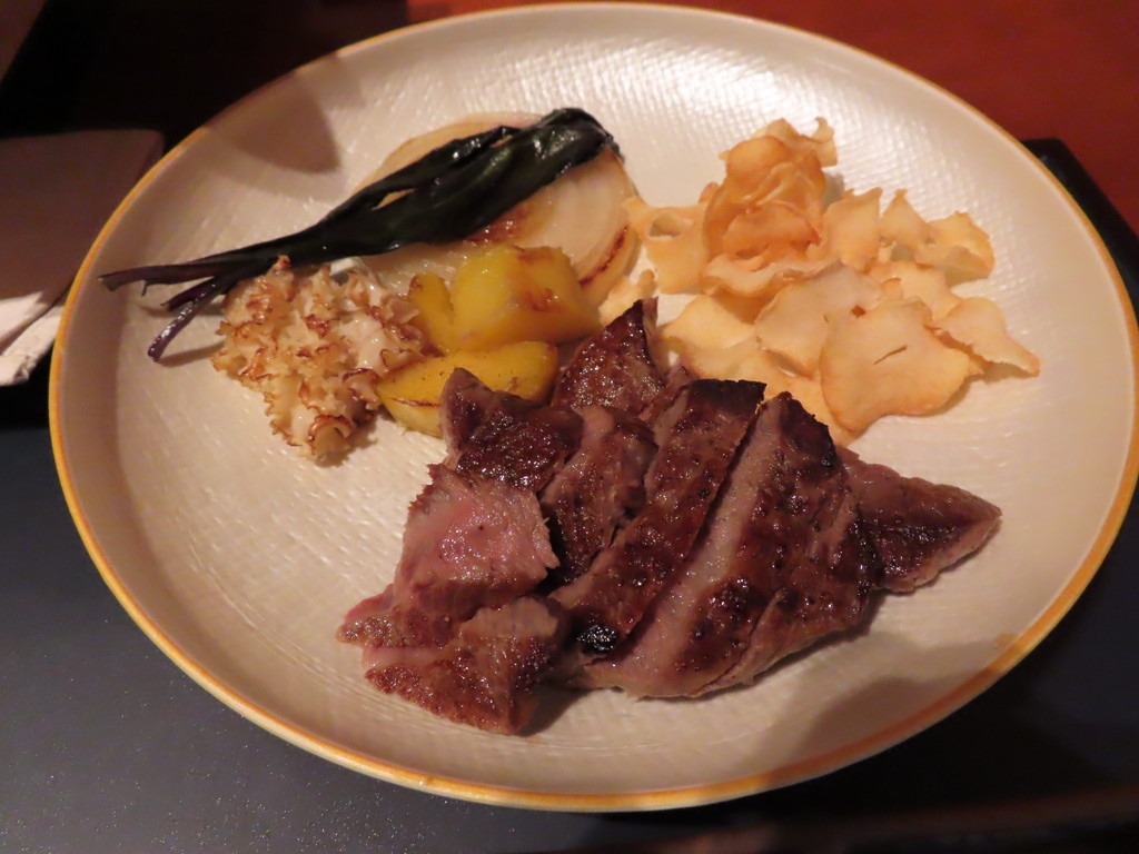 先ずは前菜、見ても楽しめる、味は上品で美味しかったです。次は焼き物、和牛の他に、キノコ、九州産ニンニクチップ、玉葱、もやしなどを美味しくいただきました。