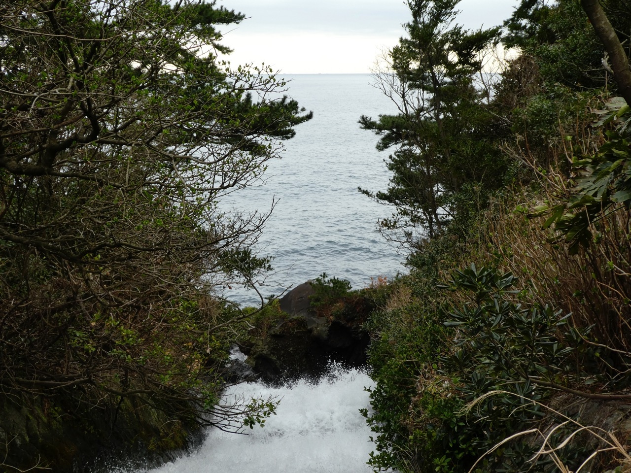 上から見てもそれしかわからず。やや左に行ったところに展望台があります。正確には展望台に向かって降りていきます。北海道の滝ほど豪快ではないですが、海に向かって段々に落ちていく滝。最後の段は直接滝壺なしに海へ。これは見ものです。ぜひとも。