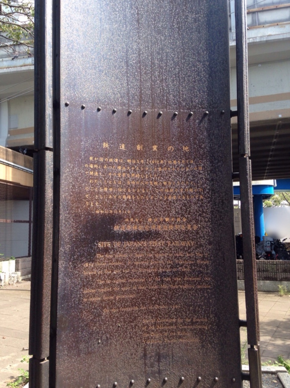 JR桜木町駅の南改札から西側に出て関内方面に歩くと国道を跨ぐ歩道橋がありますがその麓辺りの木々に覆われた空間にあります。明治時代に横浜~品川間に日本初の鉄道が開業したことは有名だと思いますがその記念碑ですね。あまり人が来ない感じの場所なのでもっと広く知られてほしいです。