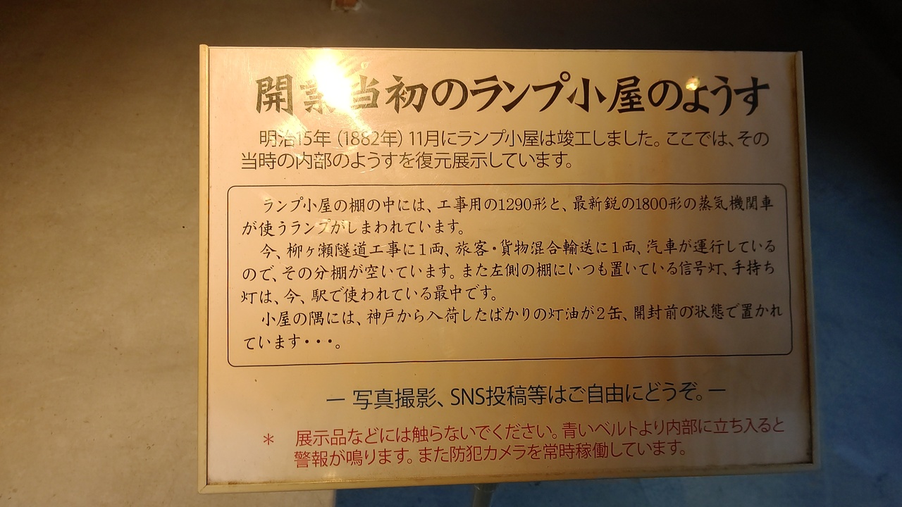 金ヶ崎城の麓にある駐車場に隣接しています。小さい建物のため、気づかず通り過ぎてしまう人も多いと思います。かつて蒸気機関車が使っていたランプで、建物に入るとランプが赤と緑に光ります。ただ、それだけです。しかし、鉄道好きにはたまらない場所かもしれません。