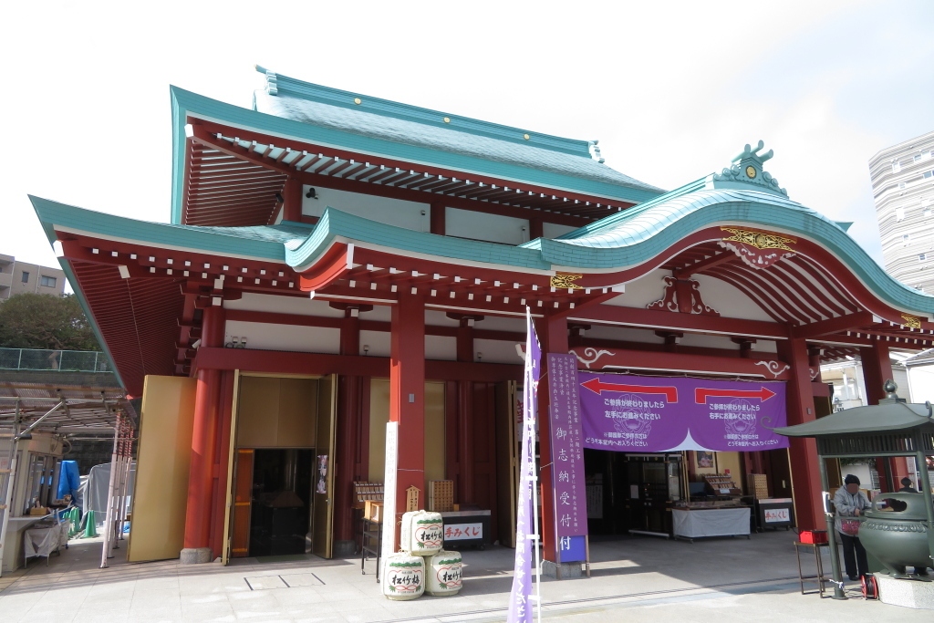 入り口部がよくわからず、桜木町方面から訪問したら、急階段を息切らせながら登りきったところに、カラフルな本堂が突然現れました。