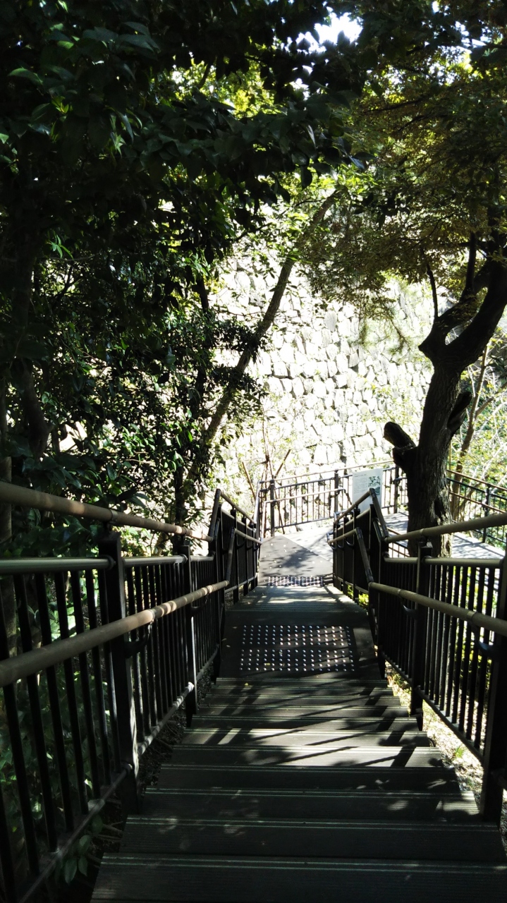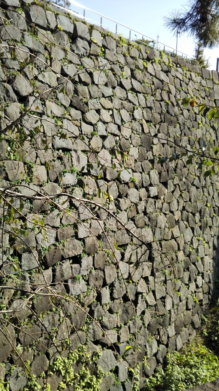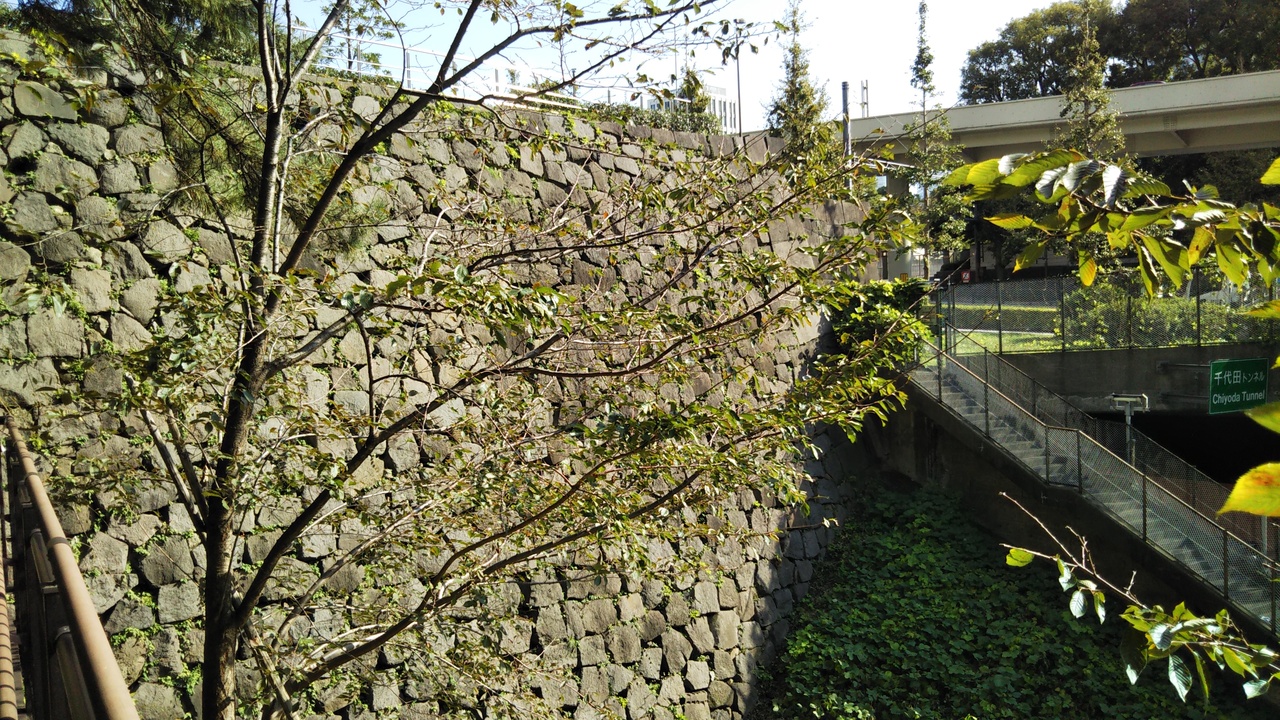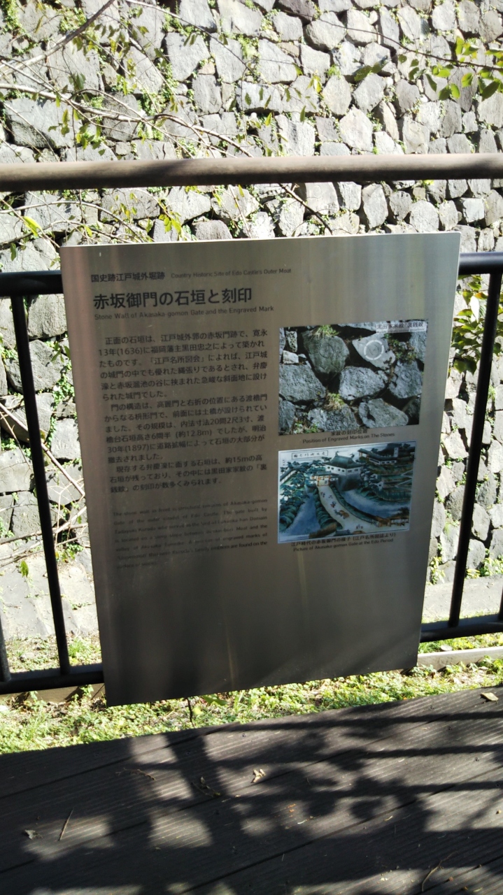 首都高が脇を走り、ホテルの高層ビルが聳える、その合間、弁慶濠沿いに石垣が残っています。水辺からの高さはかなり在って見応えが有ります。石に刻印が有るのも判ります。
