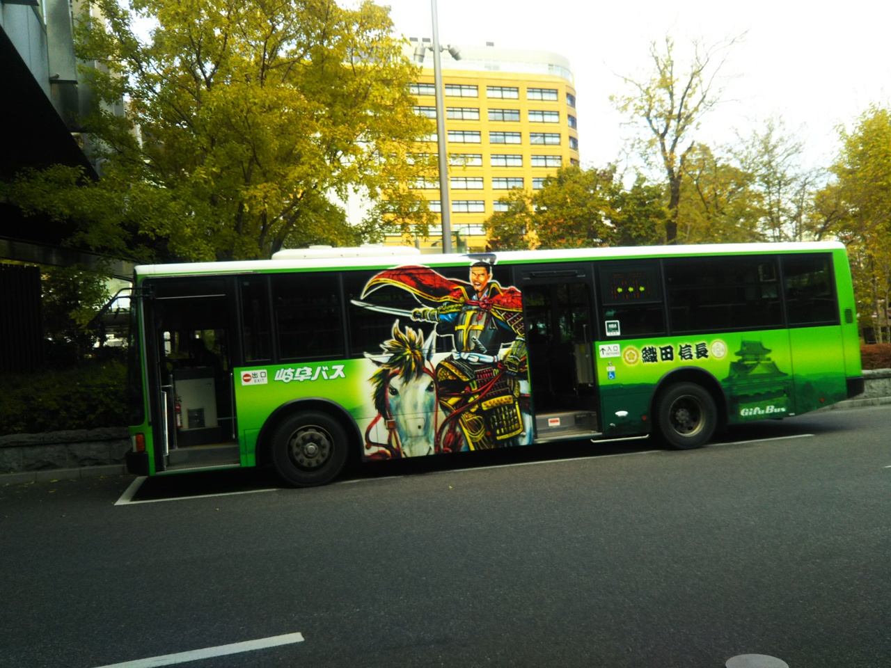 岐阜市内を走る岐阜バスという会社のバスです。JR岐阜駅から各地方へと走るバスです。岐阜市内には電車がないのでバスが主体となります。バスの車体には大きく織田信長公が描かれています。いろんなポーズや若干絵柄もちがうような感じがしますが、かっこよすぎです。
