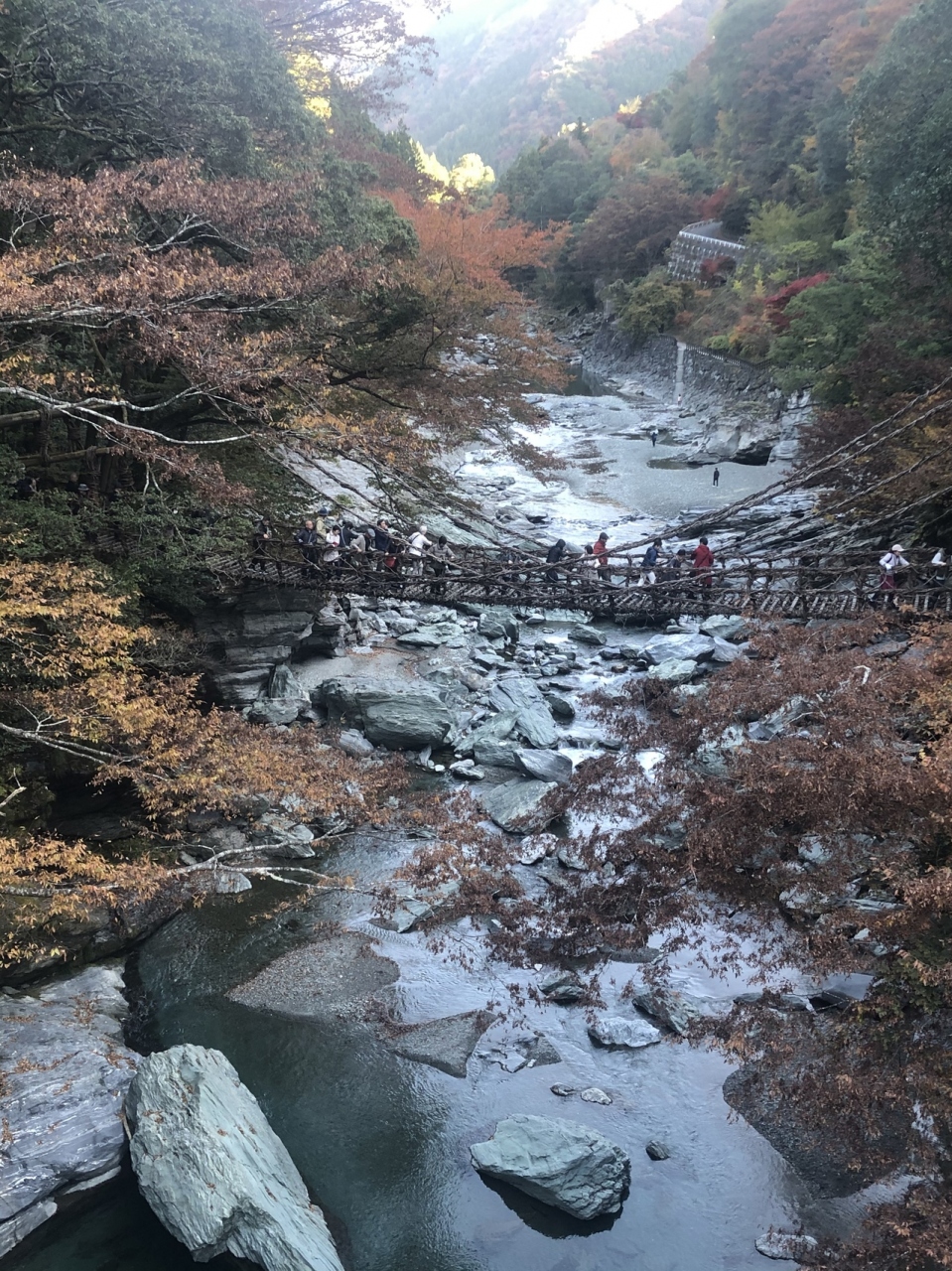 かずら橋のある渓谷です。谷の上の方には、かずら橋がかかっています。川幅はそれほど広くなく、流れも急ではありませんが、川原には大きな石がありました。かずら橋を渡った後、左側に行くと、川原に降りることができる小道がありました。