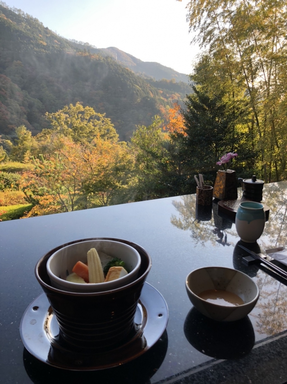 早川渓谷の紅葉と朝日と一緒にいただく朝食