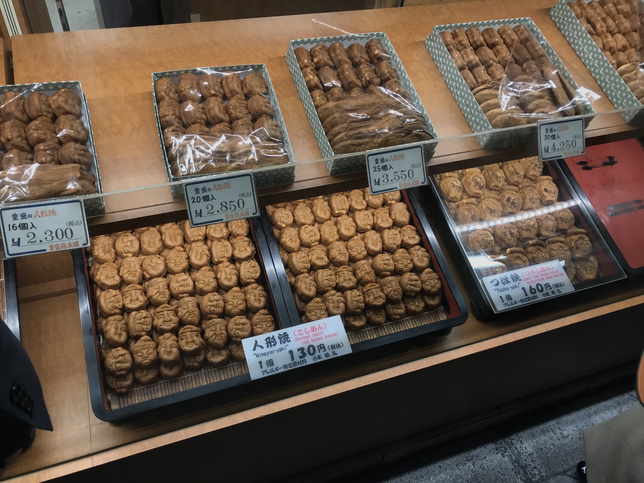 こしあん、粒あん、顔の形、壺の形といろいろな種類がありました。初めてだったので試しにバラを購入してみました。かなり甘いですが、苦にならない甘さで美味しかったです。スーパーの人形焼きとは違うなあと思いました。