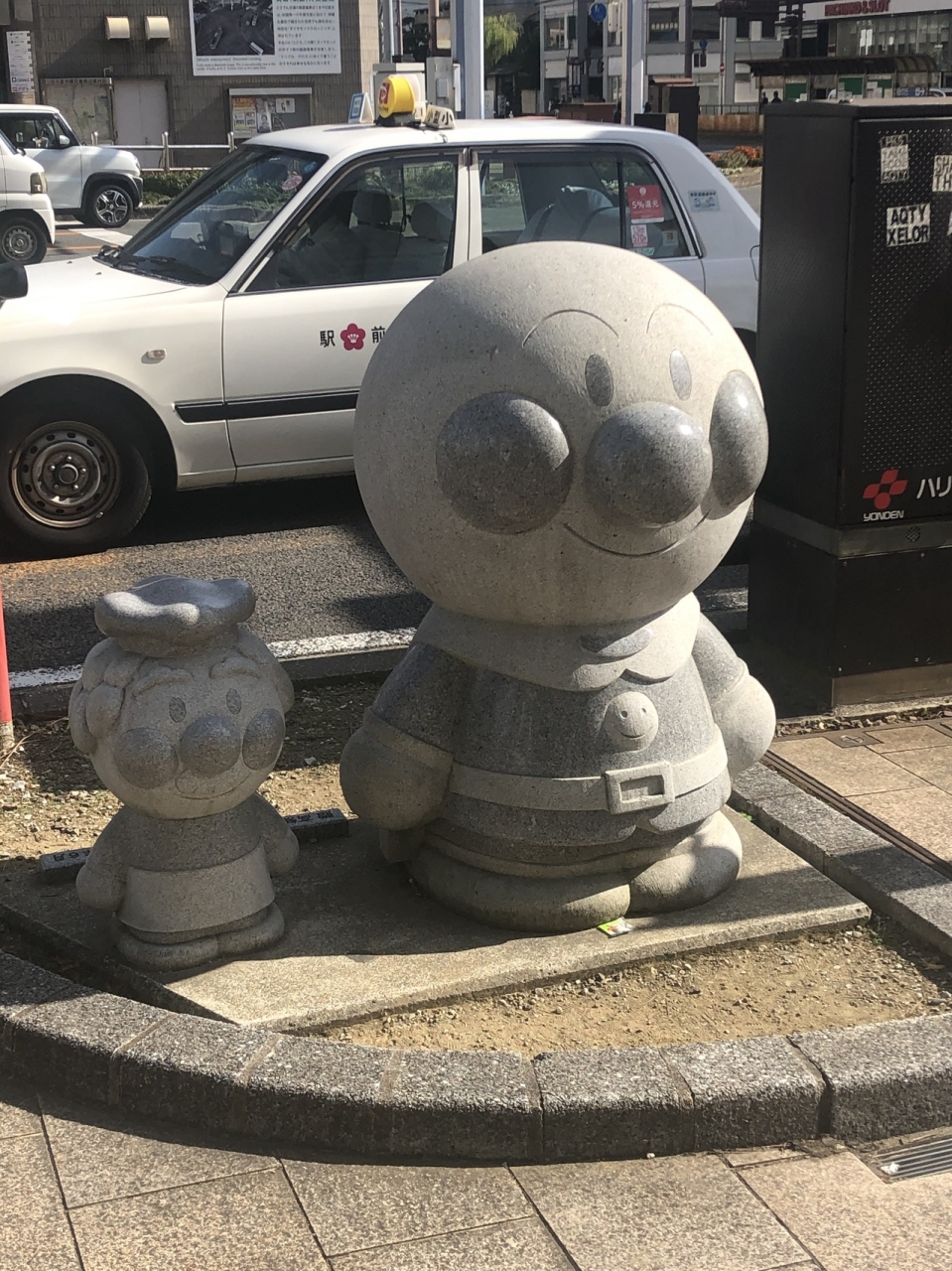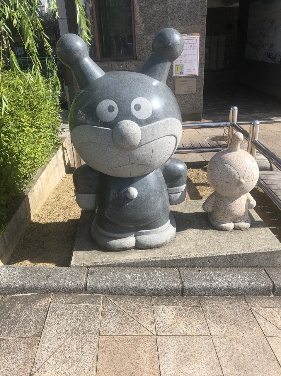 作者が高知県出身なので、アンパンマンとバイキンマンの石像がありました。はりまや橋の交差点にあり、浜幸の近くの歩道にアンパンマンの石像、反対側の歩道にバイキンマンの石像がありました。石像は比較的小さく、1mはあるかないかの大きさでした。