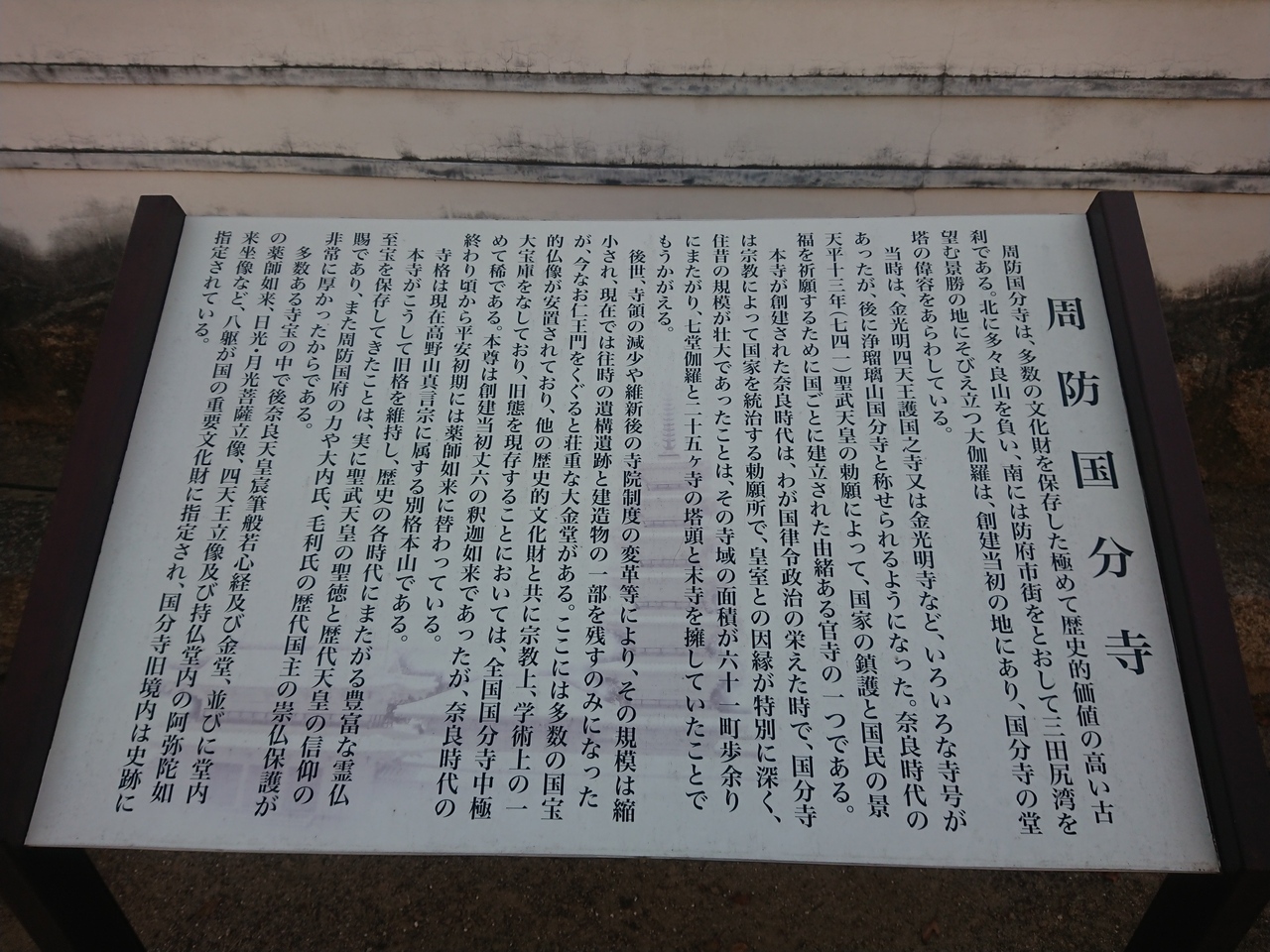 防府天満宮のお参りと合わせて、こちらの周防国分寺にも足を運びました。一度に神仏両方にお参りできるアクセスです。防府駅からだと、防府天満宮よりもさらに5分程度先に位置しておりますので、徒歩ですと結構な運動になります。歴史は防府天満宮よりも古く8世紀中頃の創建のようで、現在の金堂も何度か再建された歴史があるようです。御本尊は薬師如来ということで、特段、当方は病気を患っておりませんので、家族の健康を願いお参りして参りました。