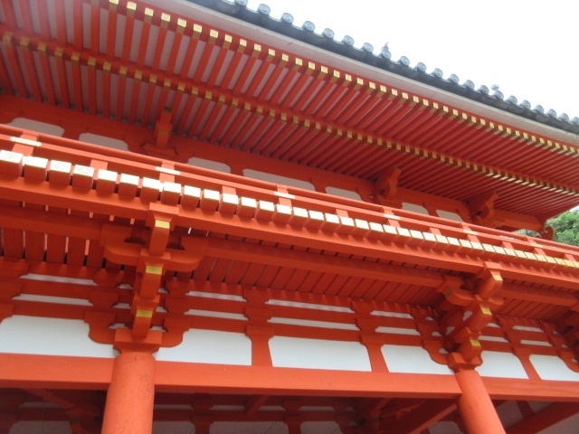 京都の八坂神社に行きました。四条通側から行って、入り口にあるのがこの大きな門です。門の前には石段があるので少し大変。でもその分大きく見えます。人はとても多い場所ですし、すぐ前が道路なのであまりゆっくり見るのは難しい場所かな?重要文化財の建物で、明治時代からあるものです。改修工事があったので、赤い柱も白い壁も色鮮やかでとてもきれいです。
