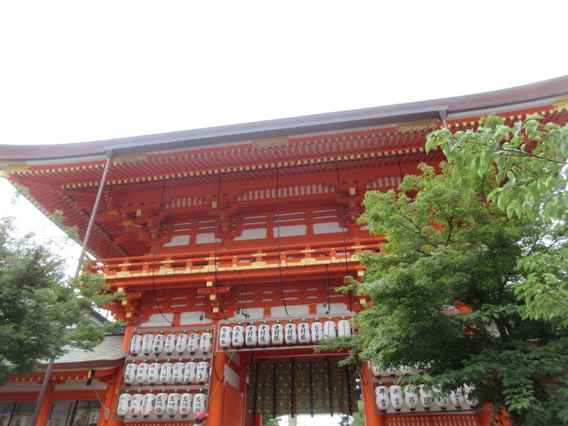 京都の八坂神社に行きました。神社は四条通沿いの入り口、西楼門がとても有名な門ですが、こちらは西側入口にある門です。こちらも十分立派な門で、祇園祭シーズンでしたので、提灯もありました。西楼門の方が目立っていますが、実はこちらの南楼門が正門だそうで、門のところには石鳥居もあります。清水坂方面からはこちらのアクセスがいいですね。