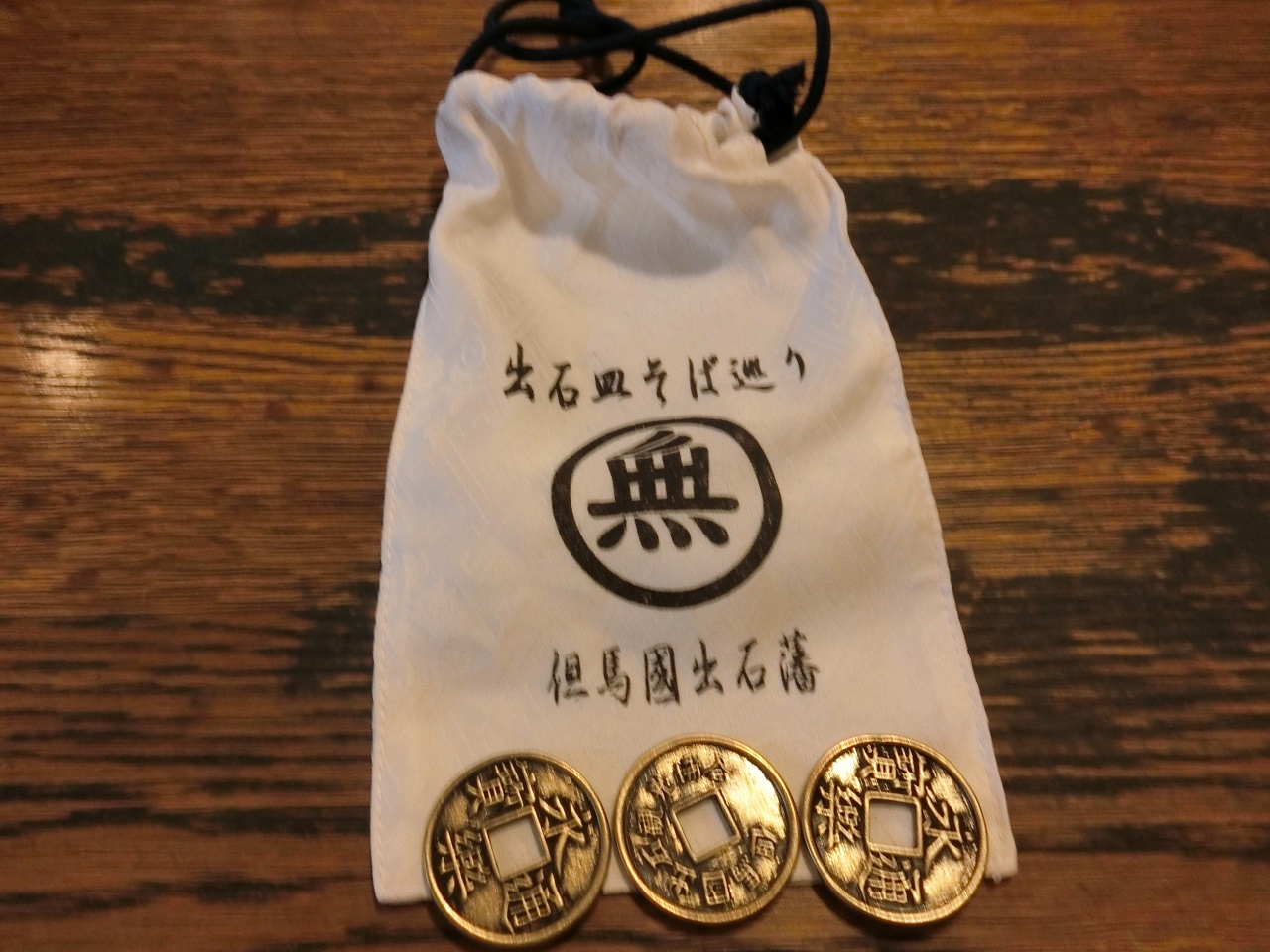 出石は皿そばが有名。お蕎麦屋さんもたくさんあるので、いろいろなお蕎麦を試したい人にはここで、出石そば巡り巾着セットが買えます。1944円(税込み)しましたが、中に永楽通貨が3枚入っているので、好きなお店3軒行かれます。1枚につき3皿いただけますが量は少ないです。蕎麦屋の味がのった地図がもらえるので、どこに行こうが迷いますが楽しかったです。