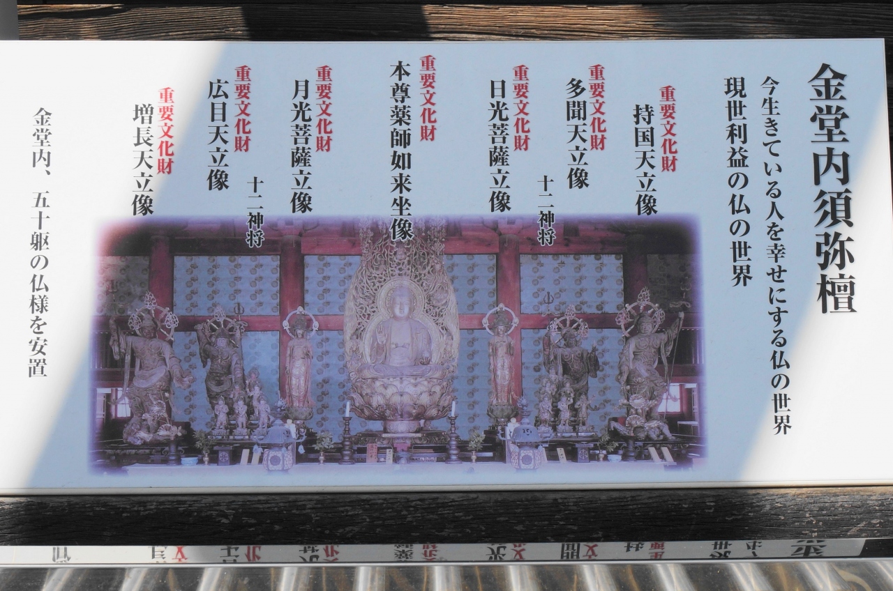 金堂には、藤原時代初期の木造日光・月光菩薩立像をはじめ多くの仏像、宝物があります。