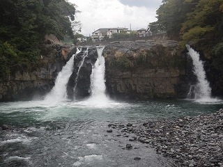 裾野市中央公園の一角にある迫力満点の滝です。高さは約13メートルと落差はさほどではありませんが、五条の滝が、ゴウゴウと音を立てて豪快に流れ落ちています。周囲には飛沫がミスト状に立ち込めていて、清涼感があります。