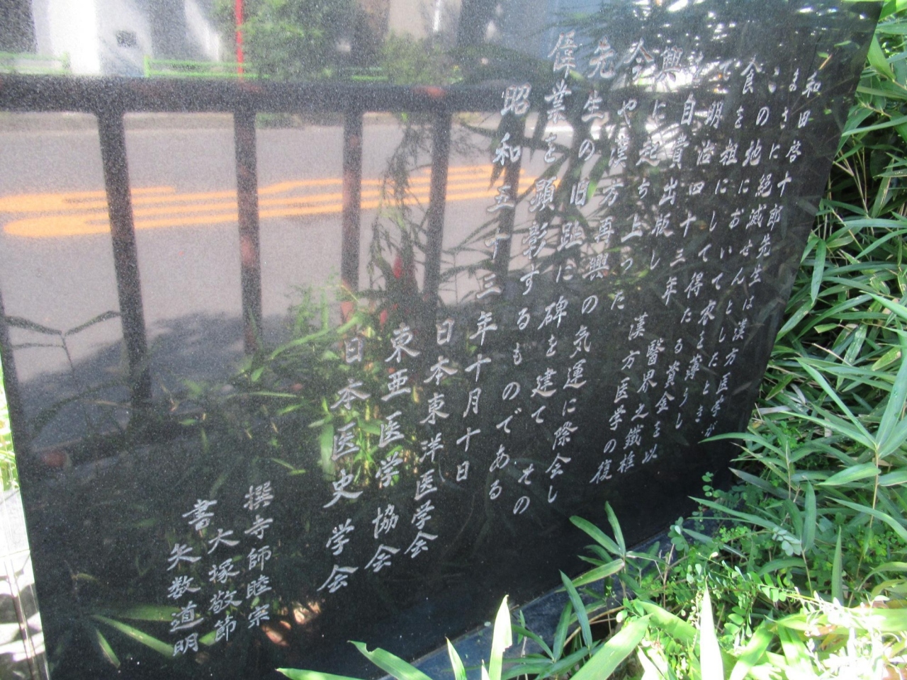 この 日本漢方医学復興之地 記念碑 は、四角で黒くてピカピカのとても綺麗な石碑だが、背が低く緑に隠れてしまいそうなので注意していないと気が付かない と思います。