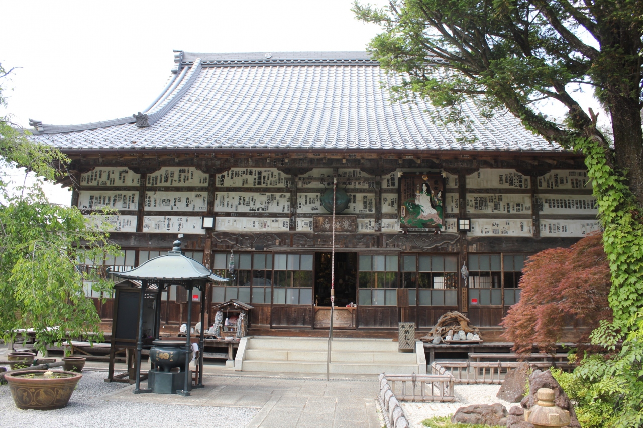 本堂は左右に広い入母屋造りで、白壁に千社札が張られているほか、境内には枯山水庭園はじめ秋葉堂や水子地蔵、交通安全地蔵などがあり、気持ち良くお参りができました。