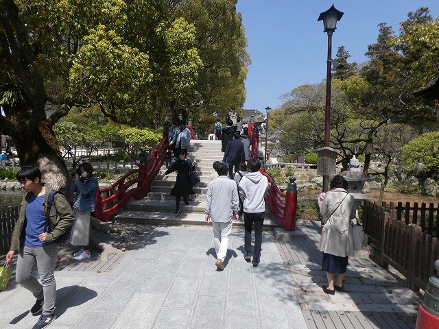 太宰府天満宮の鳥居をくぐり、中国人観光客で賑わう御神牛の前を過ぎると、天満宮の入口、太鼓橋となります。心字池にかかる朱塗りの橋。神社といえば、こうした太鼓橋は当たり前のことですが、太宰府では、太鼓橋、平橋、太鼓橋の順になっており、これが過去・現在・未来を表すのだとか。そんな意味もあるんですねえ、橋って。面倒くさくて渡りにくい橋と、いつものように何も考えず渡ってしまいました。