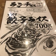 ランチで利用しました。1種類だけですが、ランチメニューもありました。餃子にご飯とスープなどが付いて700円です。餃子は肉汁がたっぷりで、皮はもちもちで美味しかったです。何も付けなくても、しっかり味が付いていました。また、夜の時間帯にも利用してみたいと思いました。