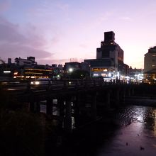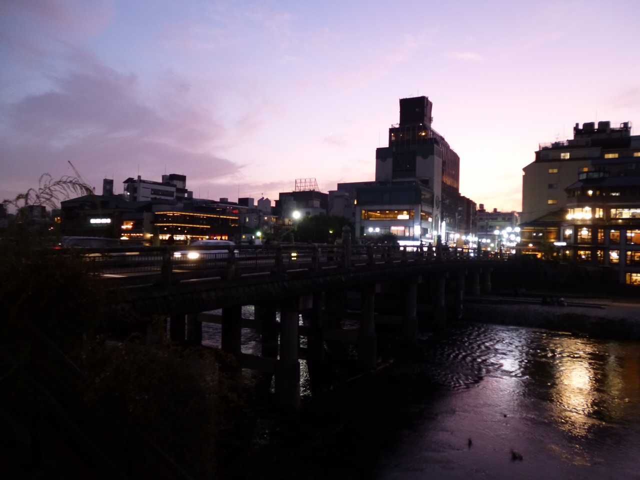 鴨川に架かる数多くの橋の中でも、もっとも多くの歴史を有するのが三条大橋ではないかと思います。橋のたもとには数多くの史跡や案内板が設置されており、歴史好きには大変興味深い場所です。四条大橋などに比べると交通量も少なく、黄昏時の光景はとても風情溢れるものです。