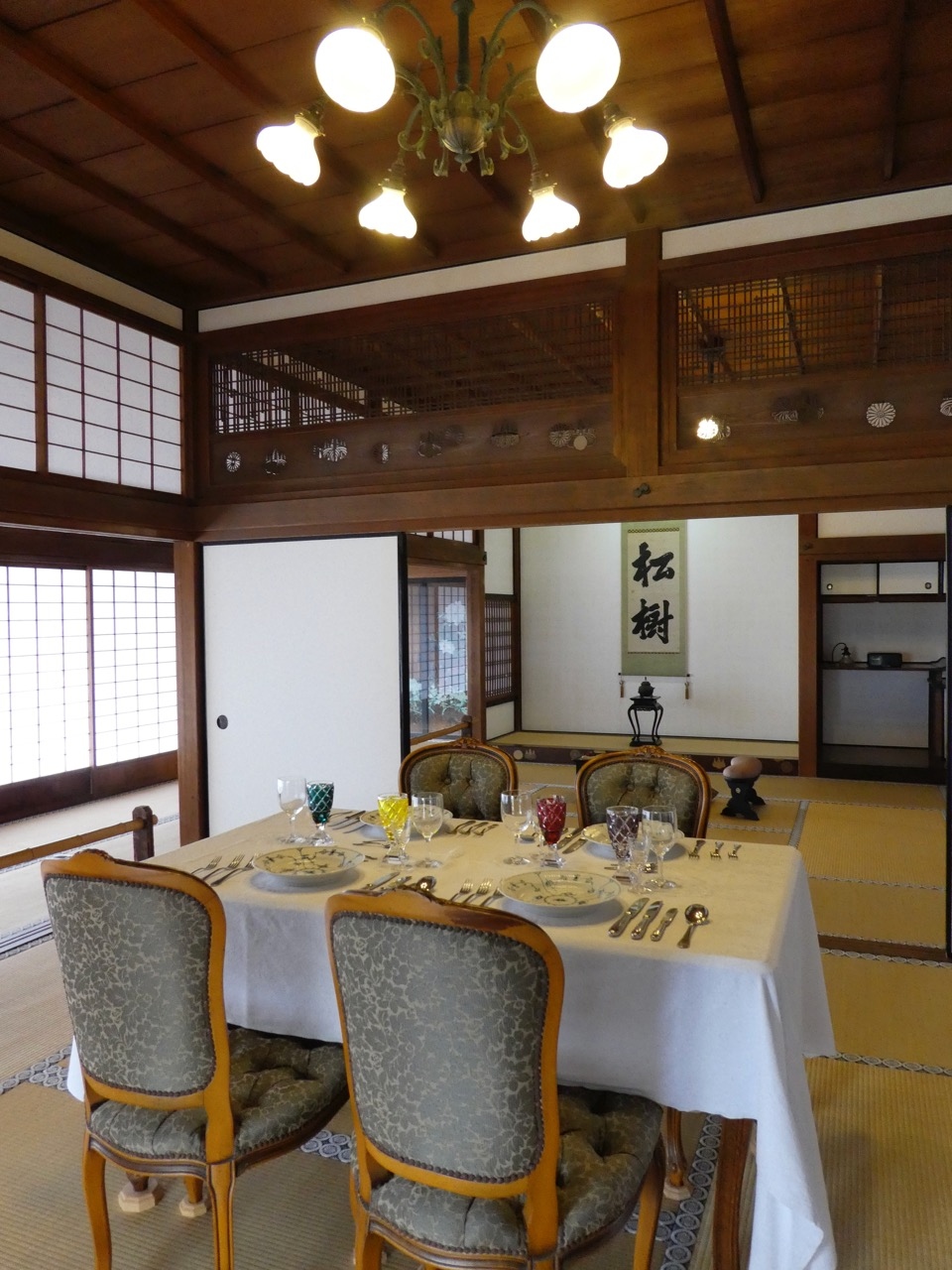 磯庭園(仙巌園)は入場料が4桁価格で高価な上、この御殿に入るのにまたさらに300円の追加です。ちょっと躊躇しましたが、入ることにしました。結果、入ってみてよかったです。昔はガイド付き案内だけだったのを普通に自由観覧にしたそうで、ところどころに係員の方がいていろいろ説明してもらえましたし、2人一緒の写真を撮ってもらったりしました。