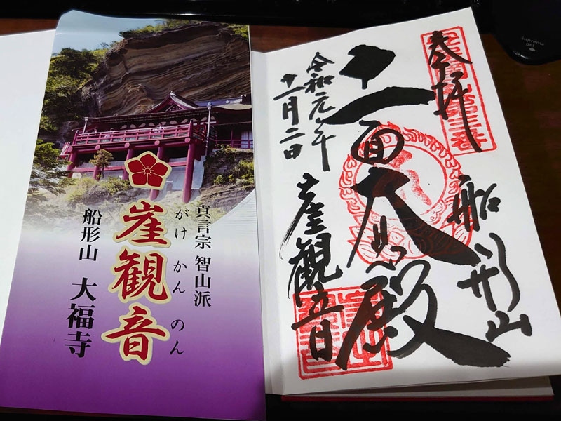 「船形山大福寺」は真言宗智山派の寺院で、切り立った山の中腹にあることから崖の観音(崖観音)と言われているそうです。カーナビで指定し細い道を通ってやっと駐車場にたどり着きましたが、下の道に「崖観音下の駐車場」がありました(;・∀・) そちらからのアクセスがオススメです。