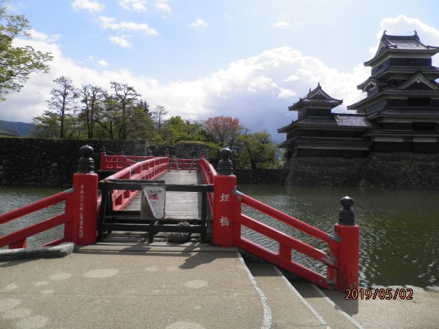 松本城へ渡る朱塗りの橋があります。以前は渡れたようですが、今は渡れなくて残念でした。松本城の黒い外観に橋の朱塗りの赤がアクセントになってきれいな景色になります。この橋は、昔の絵図にあったものを、再現したようです。