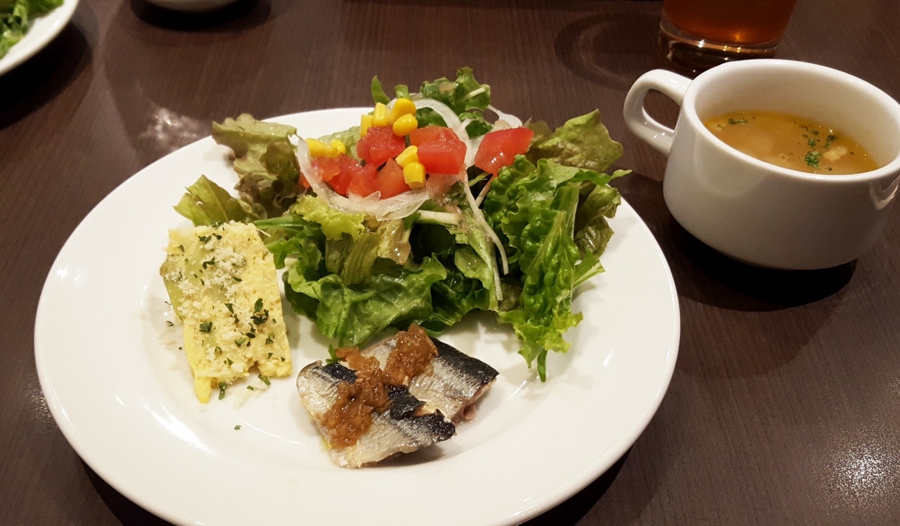【味と価格】食前の飲み物、オードブル・サラダ・スープ、パスタ、食後の飲み物で、1500円以下だから、値段も家庭的。ただオードブルとサラダのお皿の野菜はともかく、私は(魚アレルギーで)ニシンは食べられないし、スパニッシュオムレツっぽい卵料理もごくごく普通で、見かけほど美味しくなかったような。