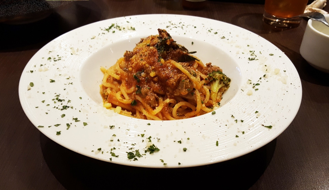 牛肉のトマトソースのパスタは太いモチモチの麺で、これも好き嫌いが分かれそうな気がする。ただ、やわらかいのにちゃんと腰があって、悪く無い。((ヨーロッパより、カナダやアメリカの(専門店ではない)パスタみたいだ。個人的な印象かもしれないが、イタリアでアルデンテに茹でたパスタは、中心部の芯に歯ごたえだけではなく小麦粉のぽそっとした食感が残っている。比べてカナダやアメリカの麺は芯が無くて、全体的に歯ごたえがある。腰の強いうどん(細麺)っぽいというか。))この店の麺は独特だけど、カナダアメリカ風で味付けにも良くあっていた。