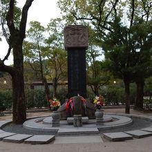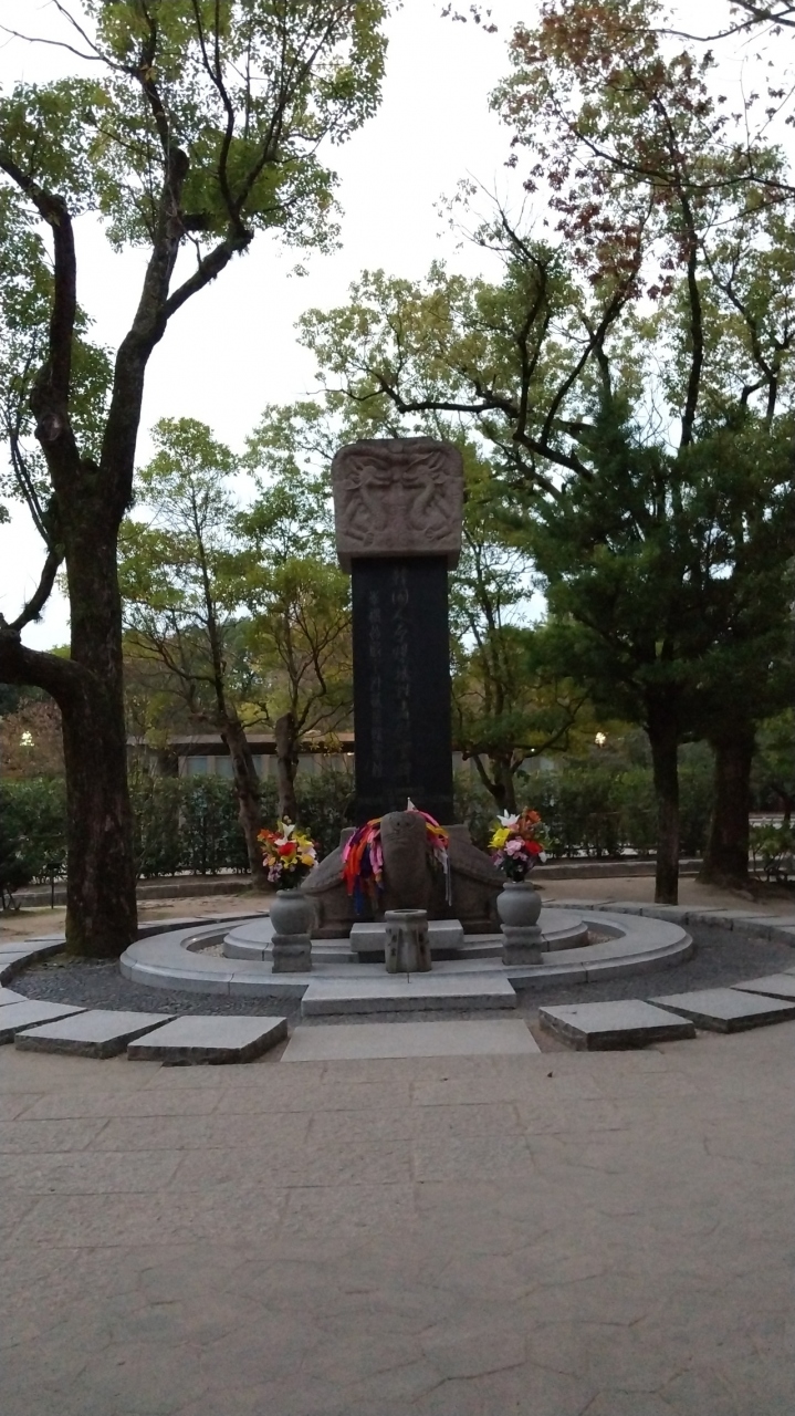 広島市の中心部にある平和公園には,原爆の犠牲になった方の慰霊碑がたくさんあり,その中の一つ,韓国人被爆者の方を慰霊した碑です。韓国の故事に基づき,亀の台座になっているのが特徴です。核兵器による犠牲が二度とないようにと,平和を願ってきました。