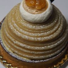 しっとりとした大き目のタルトに、栗クリーム、生クリームを盛り、栗ペーストを絞って覆い、ジャムをトッピングし、チョコレートをあしらっている。