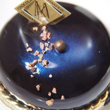 濃紺のドーム状のケーキで、金属の様な光沢を放っているのが外観上の特徴。確かに、吸い込まれる様な濃紺は、夜空そのもの。