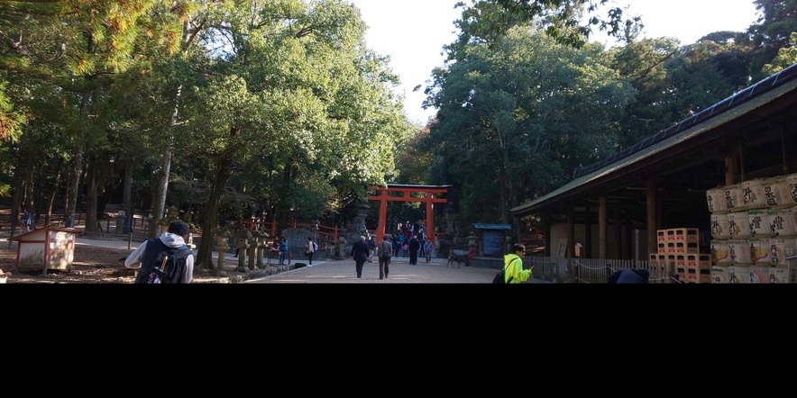 奈良公園を抜け緑の参道と樹木、石の灯籠、歩くこと約20分で朱に覆われた春日大社が見えてきます。車舎、着到殿、南門、本殿と4つの建物で構成され、若宮神社まで含めると1時間は滞在しないと見れません。駅からはバスもありますが徒歩を進めます