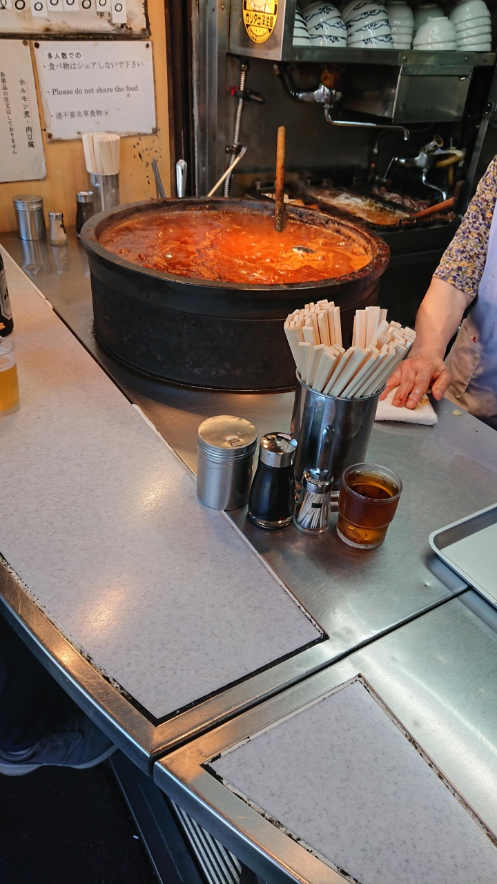 大きな鍋でグツグツとホルモンが煮込まれててとても美味しそう。