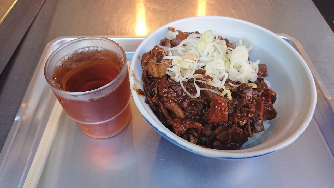 ホルモン丼を注文。お金を払いすぐに目の前で盛り付けられ、お茶と一緒にお盆に。