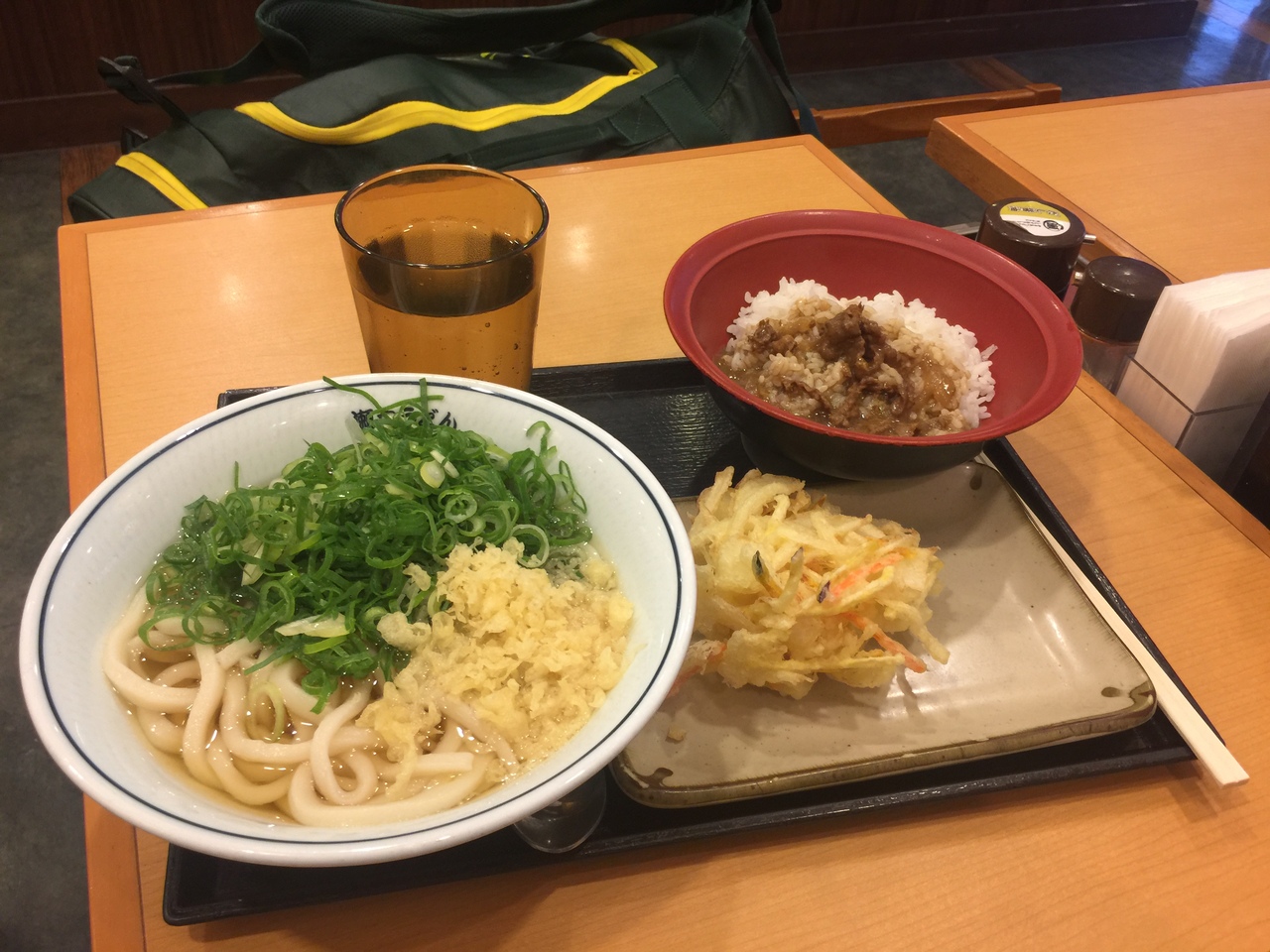 食べたのはカレー朝食!カレーライスにうどんとかき揚げ天です。麺は大盛にしました。ネギ、天かすはかけ放題!