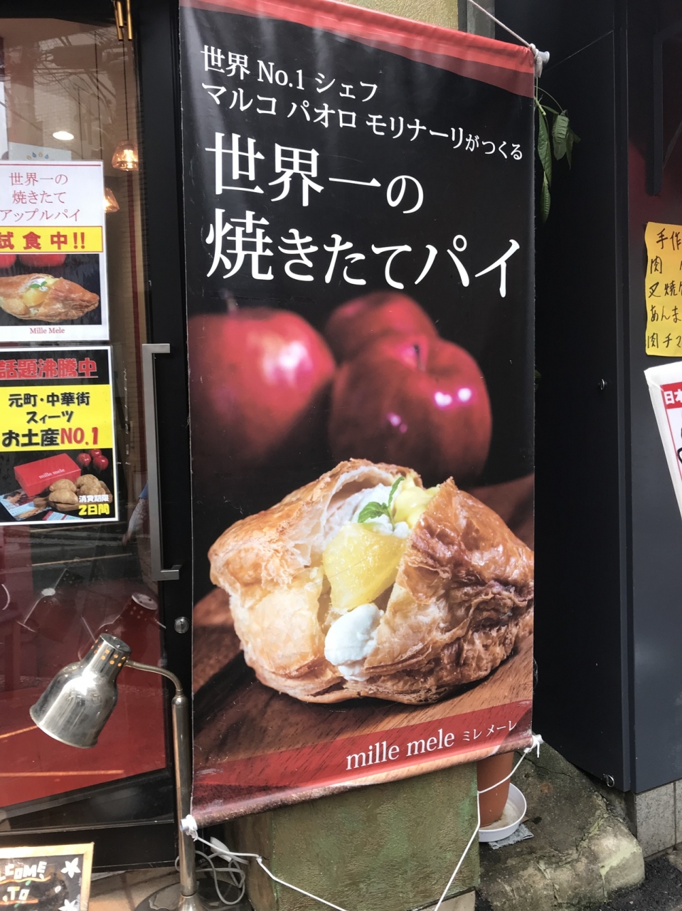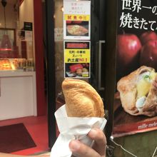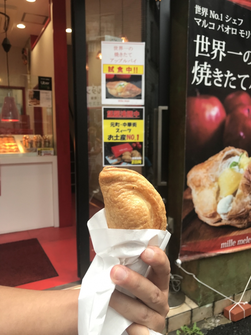 横浜中華街でランチを食べた後に、デザートとして一つ購入してみました。一つ399円 中にクリームと角切りのしっかり目のりんごが入っていました。パイはさくさく、私はアップルパイのりんごとシナモンが好きではないのですが、ここのは美味しかったです。息子用にはパイにキャラメル掛け塗り込んでいるミニパイを購入しました。