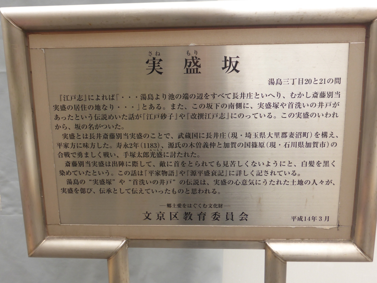 湯島三丁目、湯島天神のすぐ南にある坂。この坂下の南側に実盛塚や首洗いの井戸があったという話がいくつか残っており、この坂の名が付きました。実盛とは長井斎藤別当実盛の事で、戦では勇ましく戦い、出陣に際し白髪を染めていたそう。その心意気にうたれた土地の方々が伝承しています。思いのほか急で、手摺はありますが酔っ払っている時には通りたくない坂です。