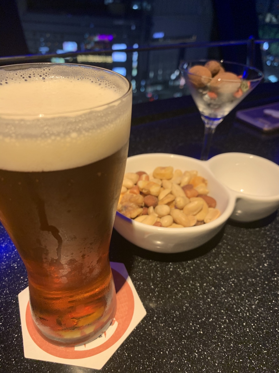 おつまみに、残念ながら夜景とは言えない京都駅前ですが、ラウンジは満席に近い賑わいでした。それでも、ゆっくり美味しいお酒を楽しめました。