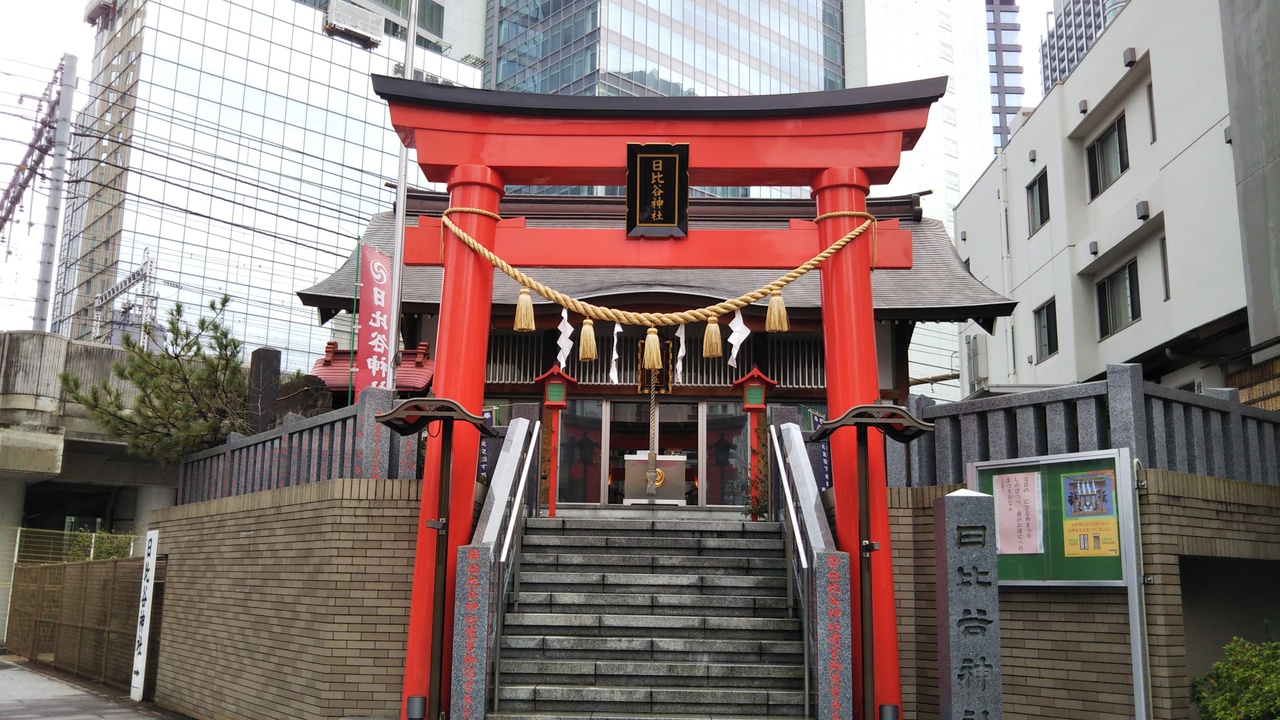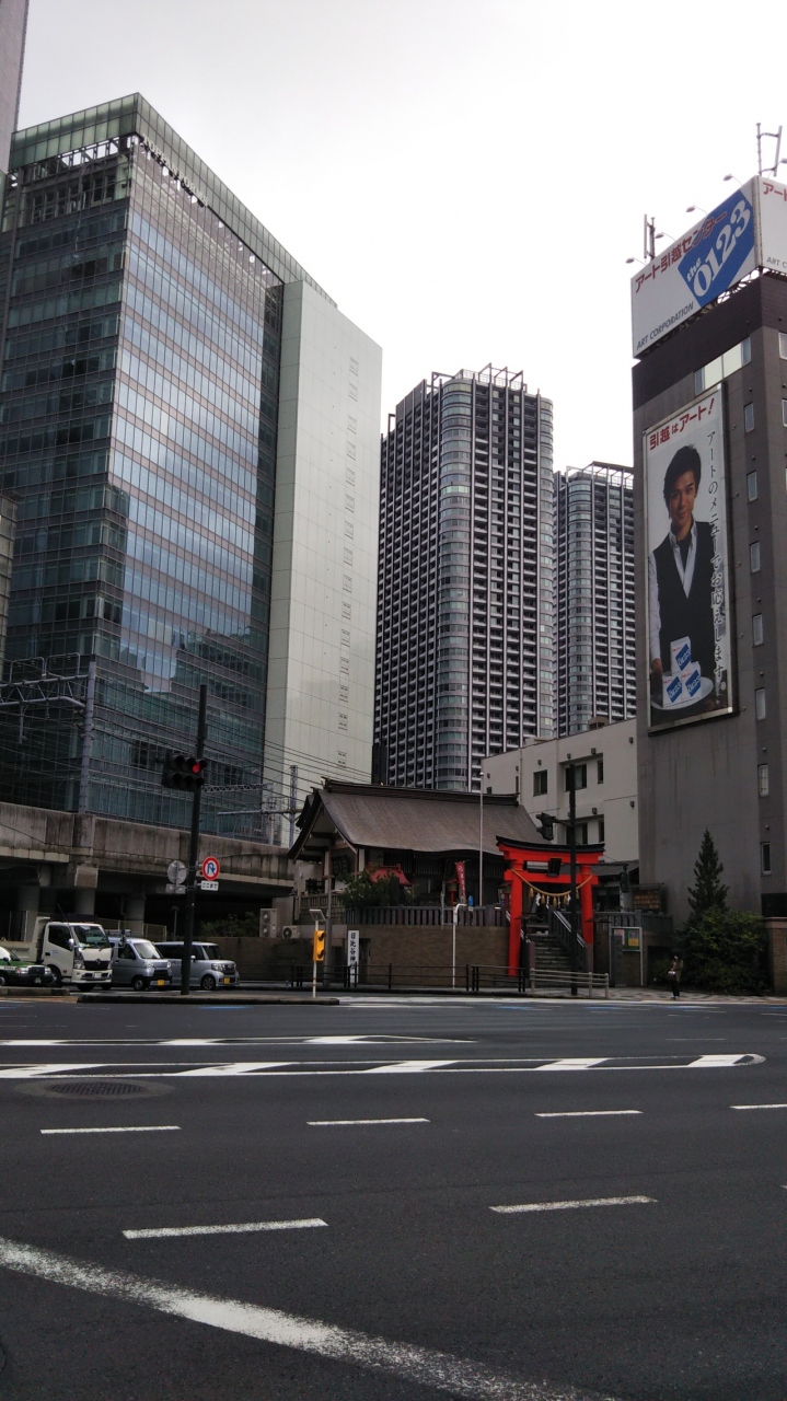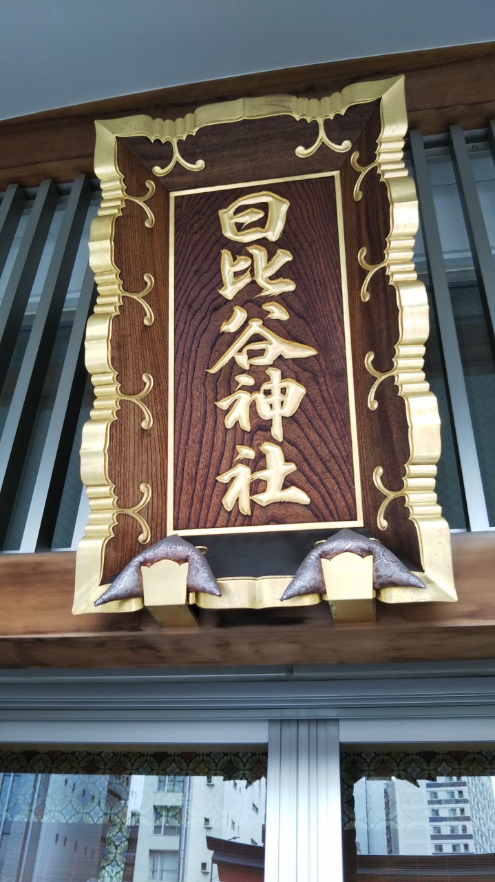 日比谷じゃないのに日比谷神社です。以前は日比谷に在ったのが移されたようですが、名前同様、周辺の景観との違和感を感じます。何しろ第一京浜と環状2号線との広い交差点の角にビルに囲まれるようにして赤い鳥居が在るのです。階段を上がった先の拝殿正面はガラス張りでした。